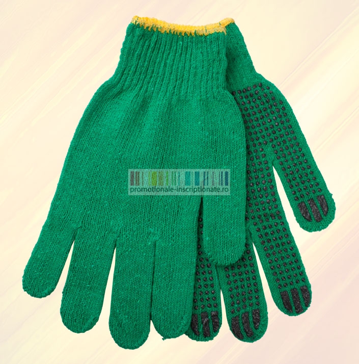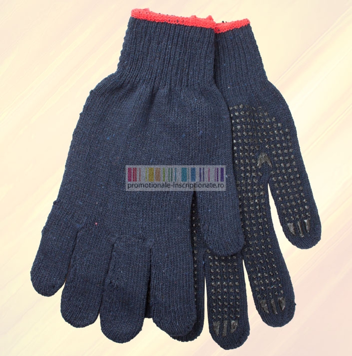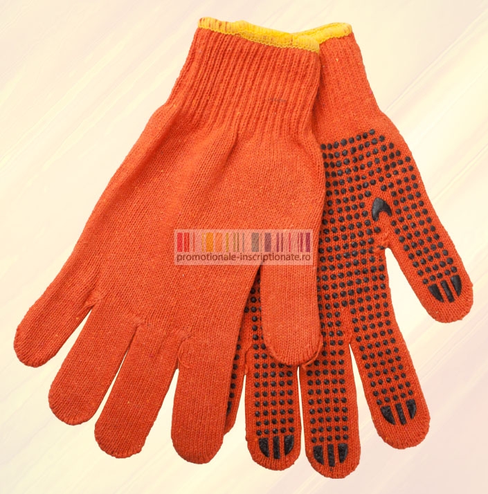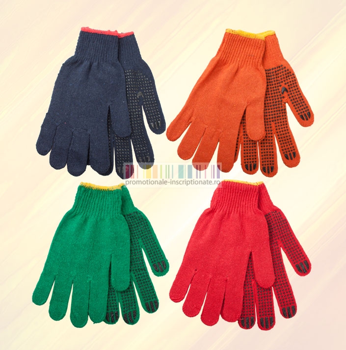 Manusi promotionale confectionate din bumbac cu suprafata anti-alunecare, disponibile in patru culori (albastru, rosu, portocaliu si verde).
