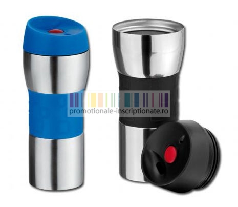 Termosuri promotionale realizate din otel inoxidabil, cu capacitate de 380 ml, grip cauciucat asortat si capac disponibil in doua culori cu orificiu pentru baut si buton rosu pentru inchidere / deschidere.