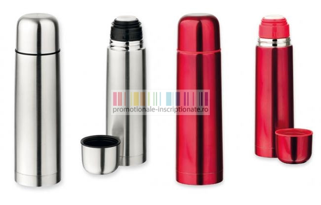Termos promotional cu design clasic, realizat din otel inoxidabil cu capacitate de 500 ml si corp cilindric cu finisari cromate - disponibile in doua culori (argintiu si rosu).