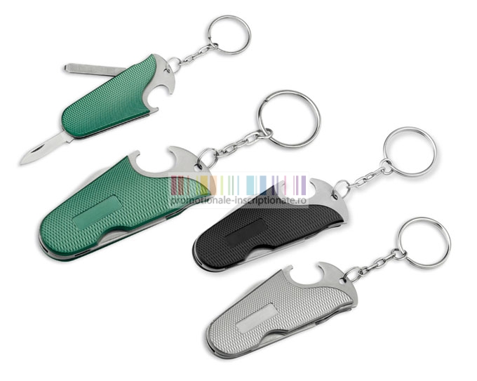 Breloc promotional realizat din metal cu trei accesorii (cutitas, pila si desfacator de sticle), cu inel metalic pentru chei si corp disponibil in trei culori (gri, verde si negru).