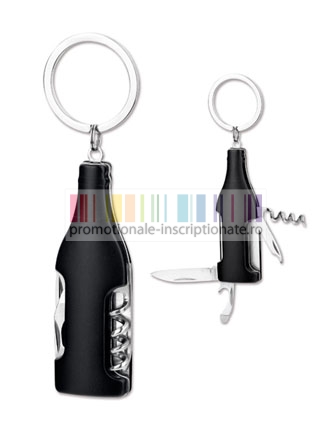 Breloc promotional multifunctional realizat din metal cu forma de sticla, cu inel metalic pentru chei si patru accesorii utile (tirbuson, desfacator de capace, cutitas si pila).