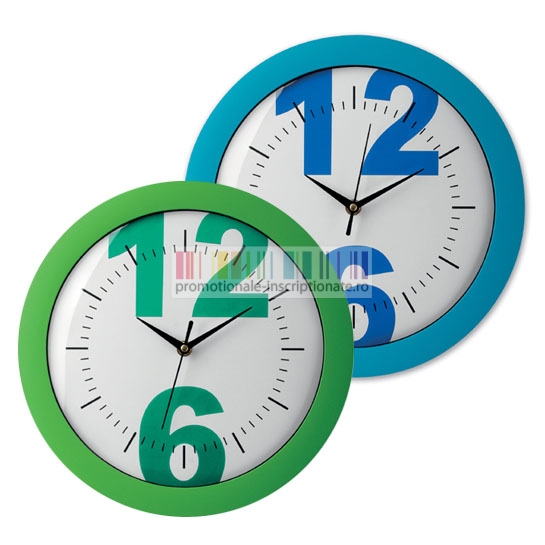 Ceasuri promotionale realizate din plastic cu forma rotunda, cadran analogic modern, rama disponibila in 2 culori (verde si albastru) cu diametru de 29,8 cm.