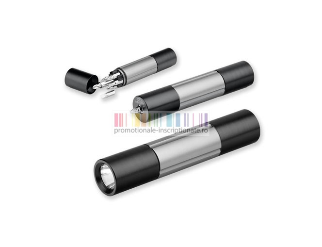 Lanterna promotionala realizata din metal cu bec de 1 W la un capat si sase surubelnite cu functii diferite la celalalt capat.