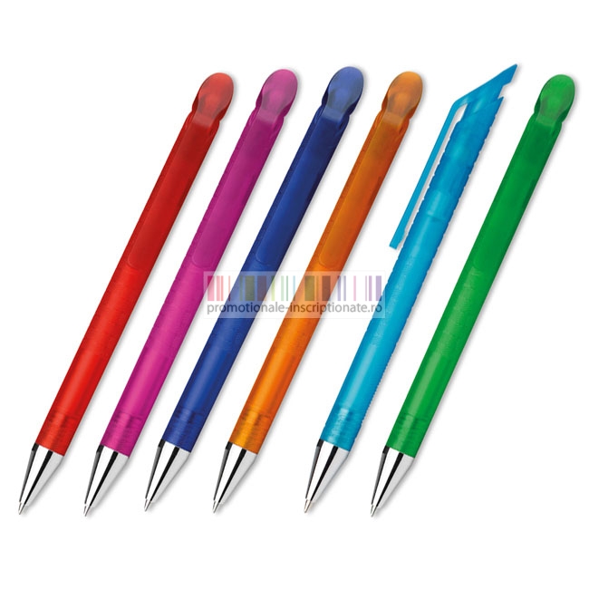 Pix promotional realizat din plastic semitransparent, cu agatatoare lata, pasta de scris albastra, mecanism de deschidere prin apasare si accesoriu metalic cromat.