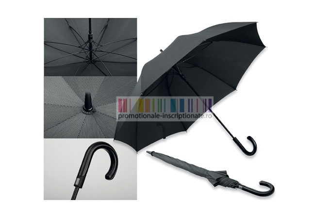 Umbrela promotionala neagra, cu mecanism automat si dimensiune de 120 cm, confectionata din poliester cu opt panele si maner curbat din imitatie de piele.