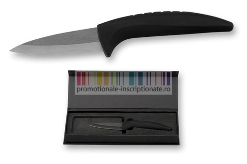 Cutit promotional de bucatarie cu lama de 7 centimetri realizata din ceramica, cu maner negru curbat si cutie neagra de cadou.