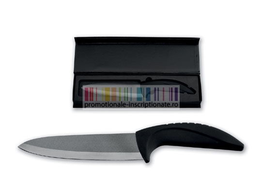 Cutit promotional realizat din ceramica cu lama de 15 centimetri, maner negru curbat si cutie de cadou.