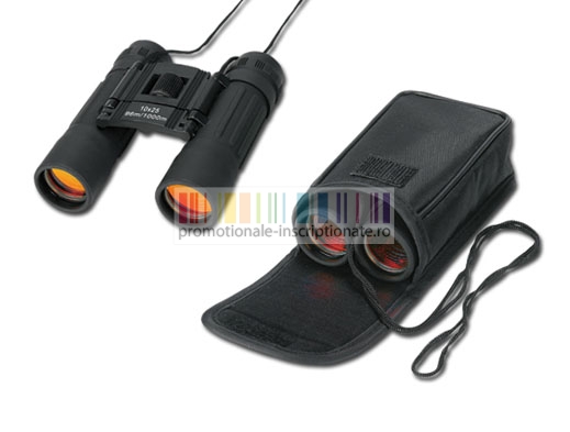 Binoclu promotional realizat din plastic cauciucat cu lentile colorate (zoom 10 x 25), elemente metalice si snur subtire pentru gat.