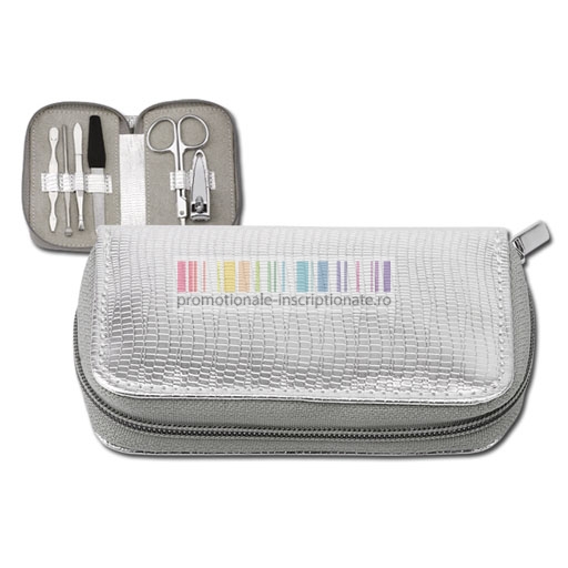 Trusa promotionala pentru manichiura si pedichiura, cu forfecuta, unghiera, pila, penseta si doua instrumente pentru cuticule - toate realizate din metal si prezentate in etui elegant din imitatie de piele cu inchidere prin fermoar.