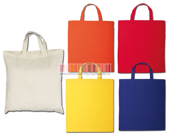 Sacose promotionale de cumparaturi, confectionate din bumbac de 100 gr/mp si disponibile in 5 culori cu toarte scurte.
