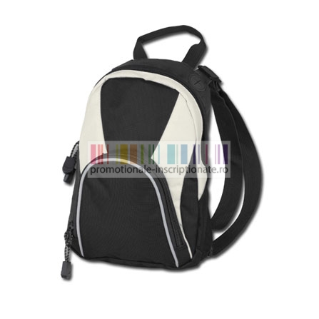 Rucsaci promotionali confectionati din poliester 600D, cu orificiu pentru casti, compartiment principal cu fermoar dublu, buzunar frontal cu fermoar, maner mare si barete de umar ajustabile.
