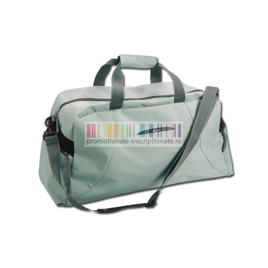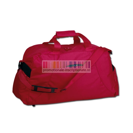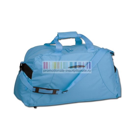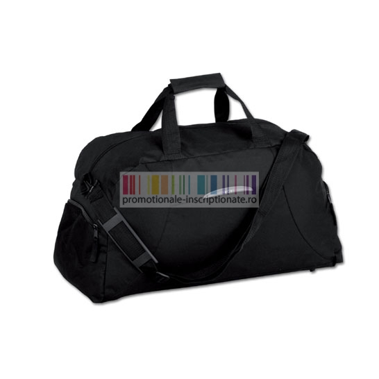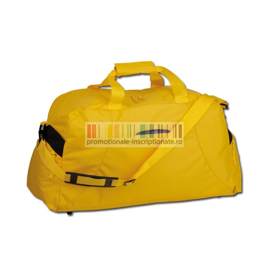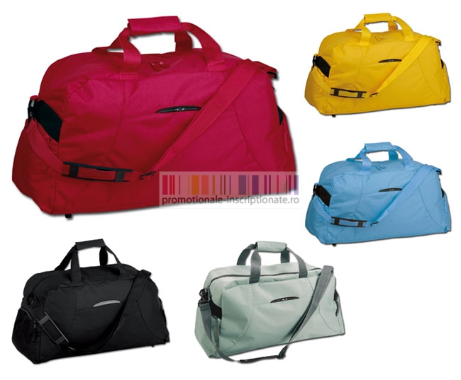 Genti promotionale de voiaj confectionate din poliester 420D, cu compartiment principal cu inchidere prin fermoar dublu, doua buzunare laterale cu fermoar, manere rigide prinse la mijloc si toarta ajustabila cu carabina din plastic pentru umar.