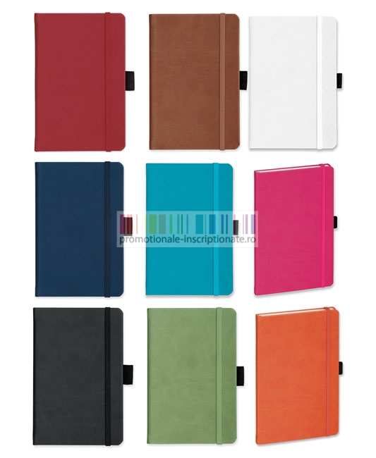Carnetele A5 promotionale cu coperti rigide din carton disponibile in sase culori, cu 192 de pagini liniate cu colturi rotunjite, buzunar interior, elastic asortat pentru prindere si suport pentru pix.