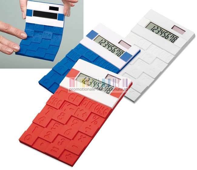 Calculator promotional de birou, realizat din silicon cu dubla alimentare, afisaj digital pentru opt cifre si baterie inclusa.