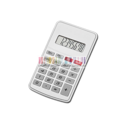 Calculatoare promotionale de birou cu carcasa din plastic alb si butoane cauciucate gri, cu baterie inclusa si display digital de opt cifre.