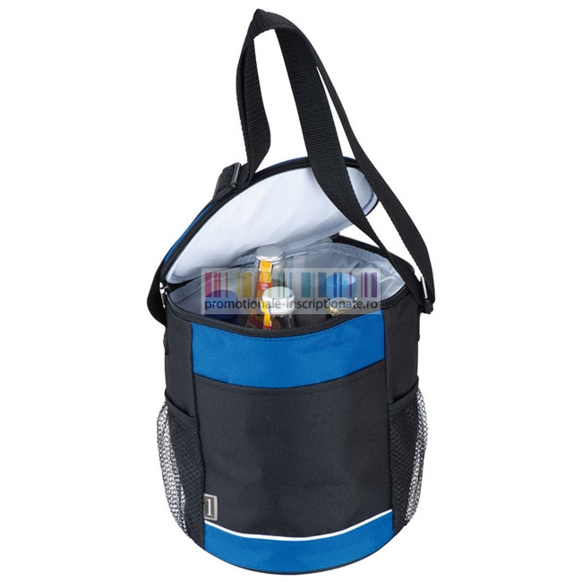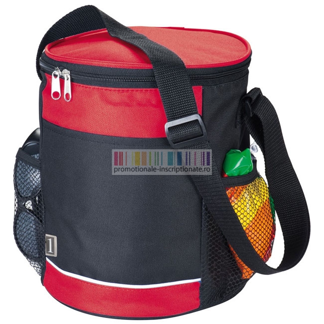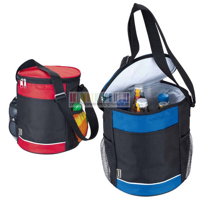 Genti termoizolante confectionate din poliester 600D si disponibile in doua culori cu forma rotunda, compartiment spatios cu inchidere prin fermoar dublu, doua buzunare laterale din plasa cu elastic si bareta ajustabila pentru umar.