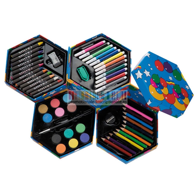Seturi promotionale de pictura si desen pentru copii, compuse din 12 creioane cerate, 12 carioci din plastic cu capac alb, 12 creioane colorate din lemn cu varfuri ascutite, tableta cu 12 culori pentru pictat cu pensula, ascutitoare, guma de sters si semn de carte - toate prezentate in cutie cu forma hexagonala realizata din carton colorat.