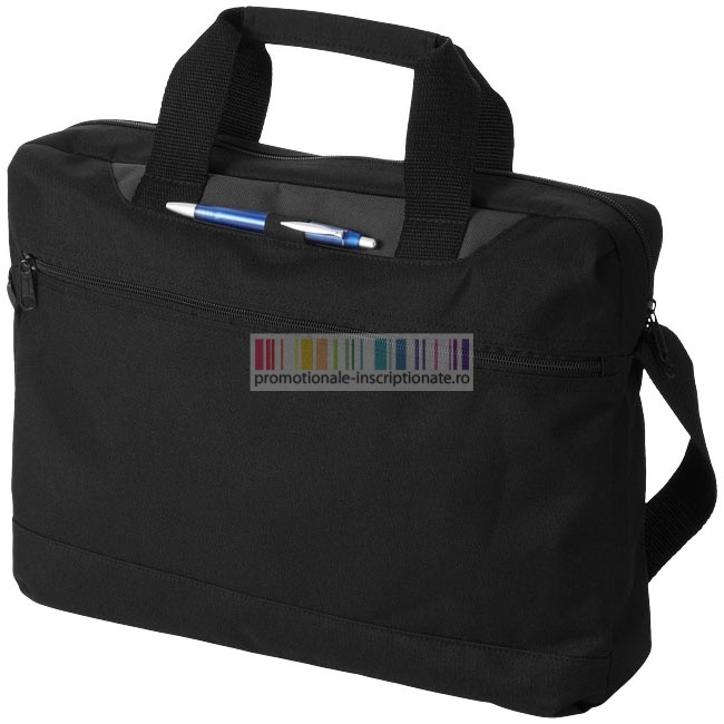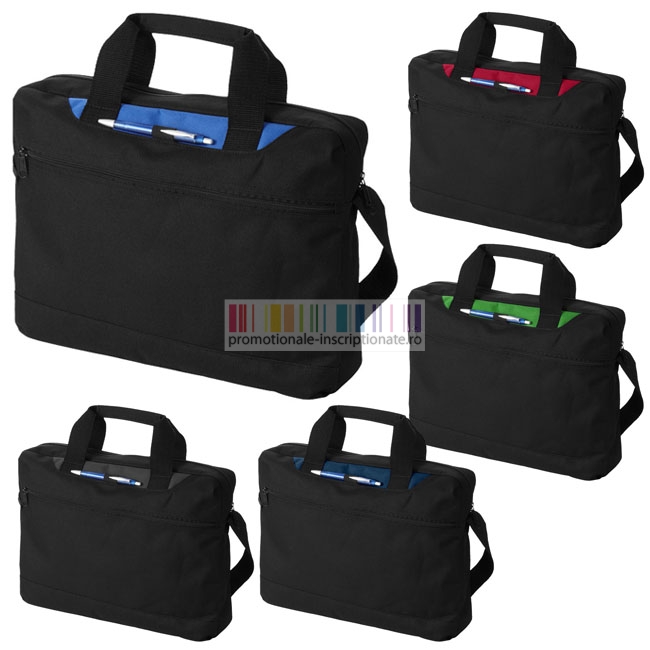 Genti promotionale pentru documente, confectionate din poliester 600D si disponibile in cinci culori, cu suport pentru pix, buzunar frontal cu fermoar, compartiment principal spatios cu inchidere prin fermoar, manere prinse la mijloc si bareta ajustabila pentru umar.