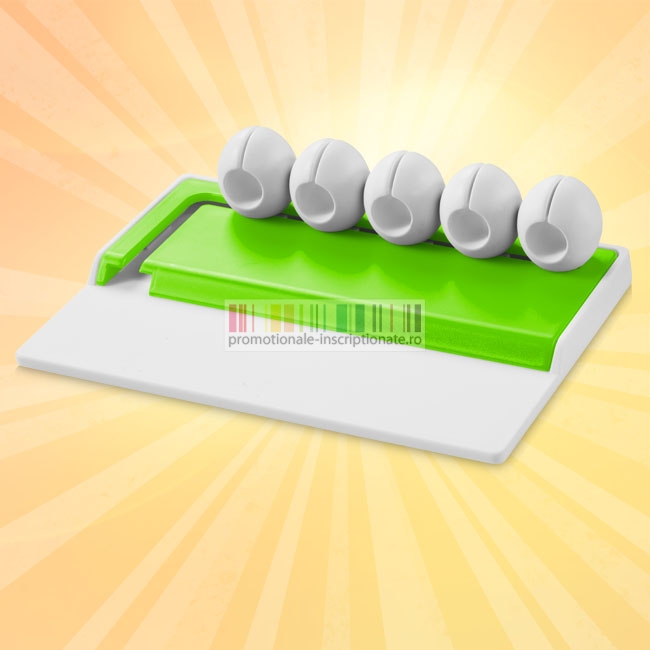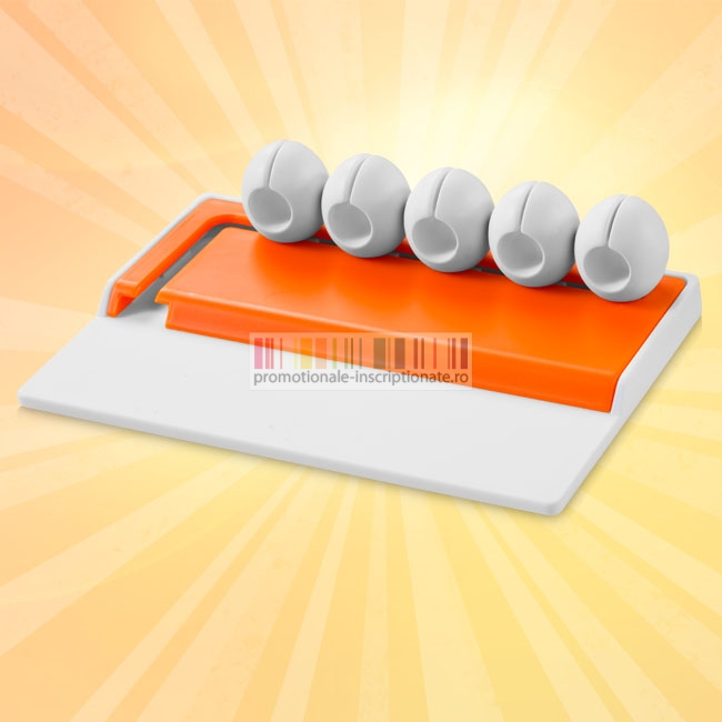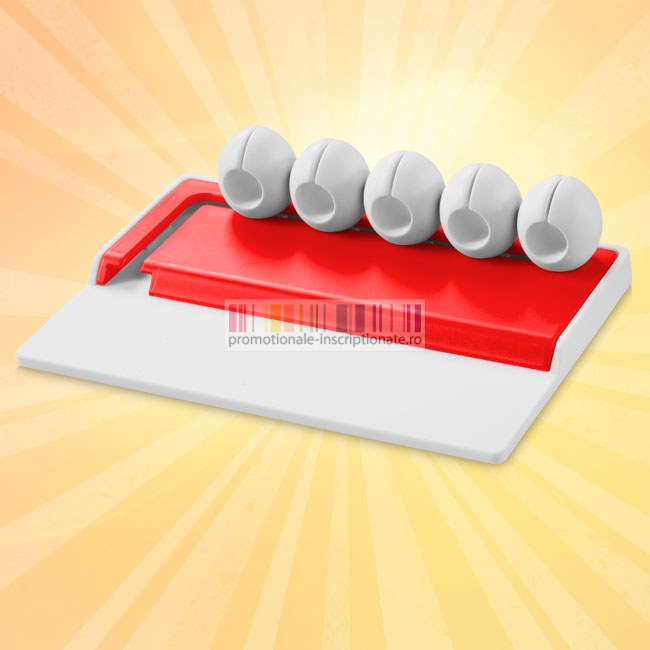 Organizator promotional pentru cabluri, cu suport realizat din plastic prevazut cu banda adeziva pentru fixare si cinci orificii pentru aranjarea cablurilor.