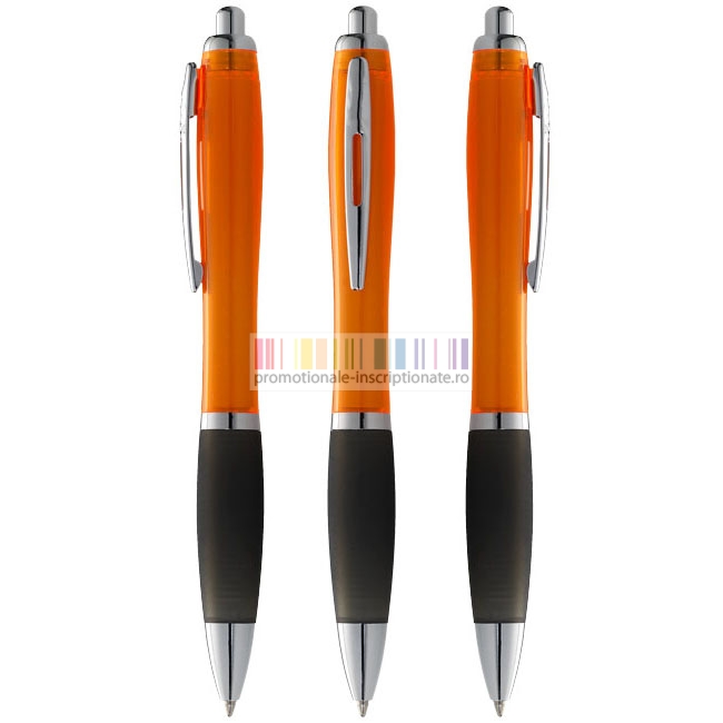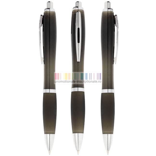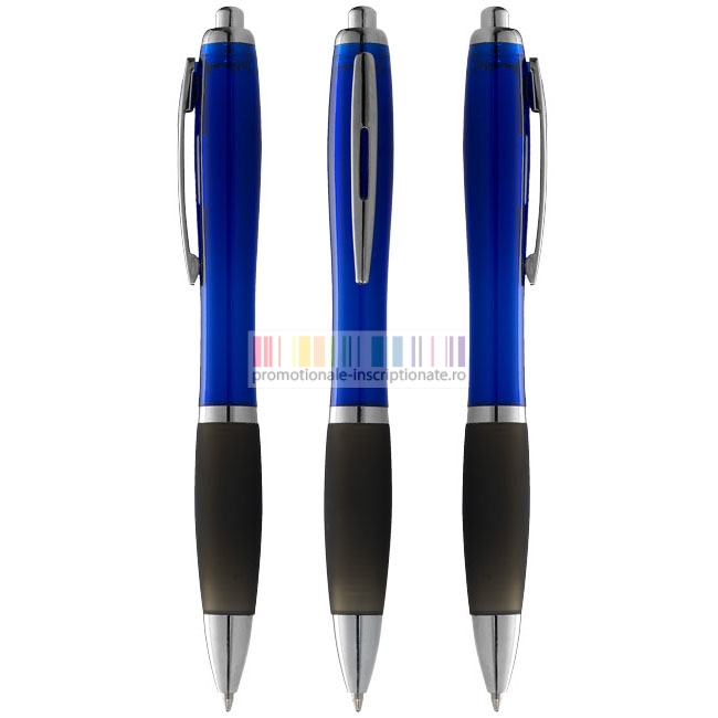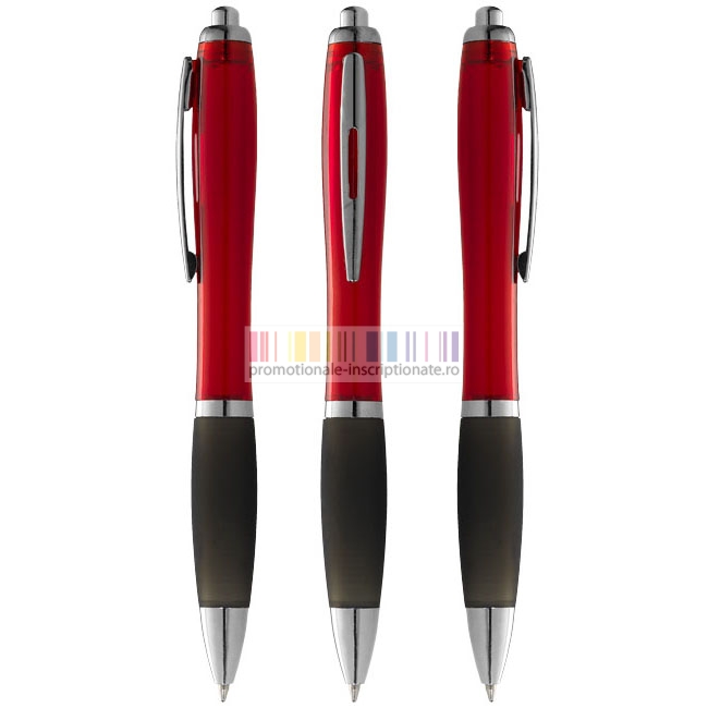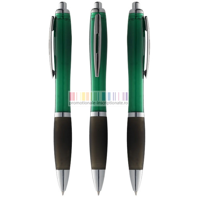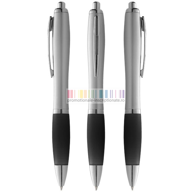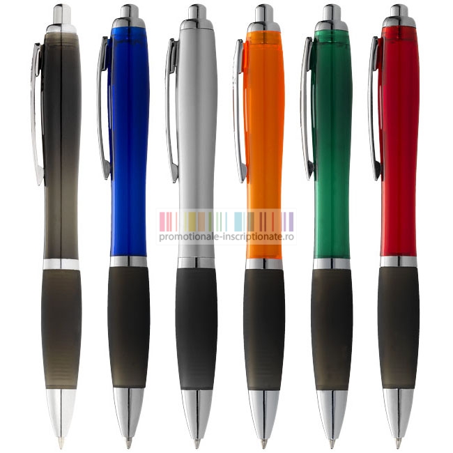 Pixuri promotionale cu corp ergonomic disponibil in sase culori, grip negru cauciucat, accesorii metalice argintii si agatatoare eleganta.