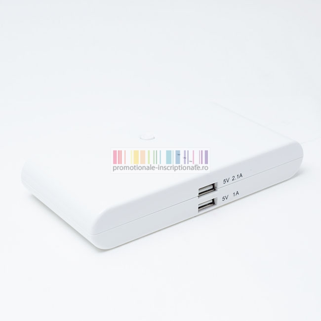 Power bank-urile au carcasa alba din plastic cu zona mare de personalizare, alimentare 5V/1A, indicator, cablu USB inclus si sistem de protectie pentru supra-incarcare, supra-alimentare si scurt circuit.