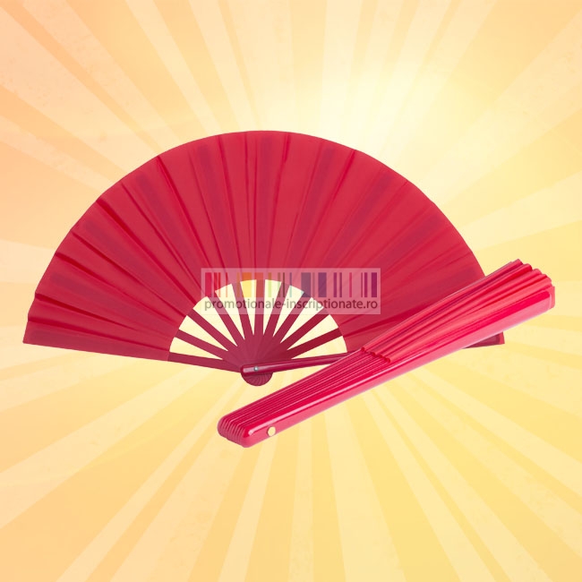 Evantai promotional confectionat din material textil si disponibil in cinci culori cu manere colorate din plastic.
