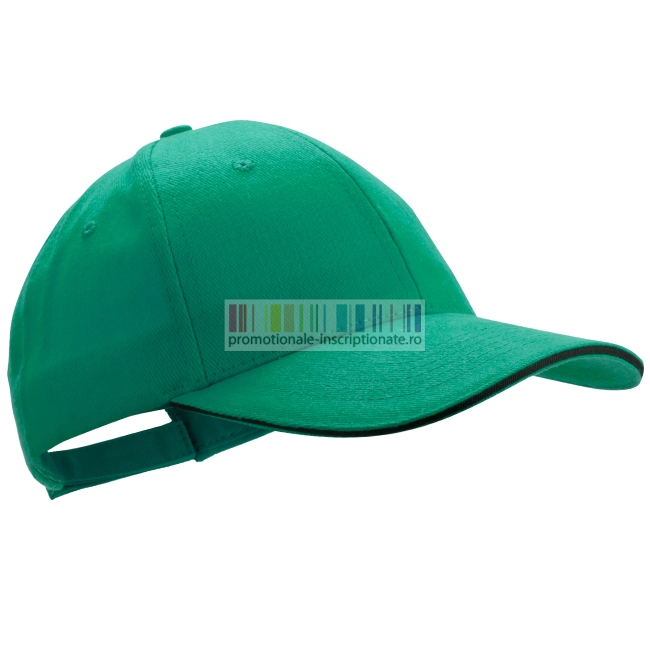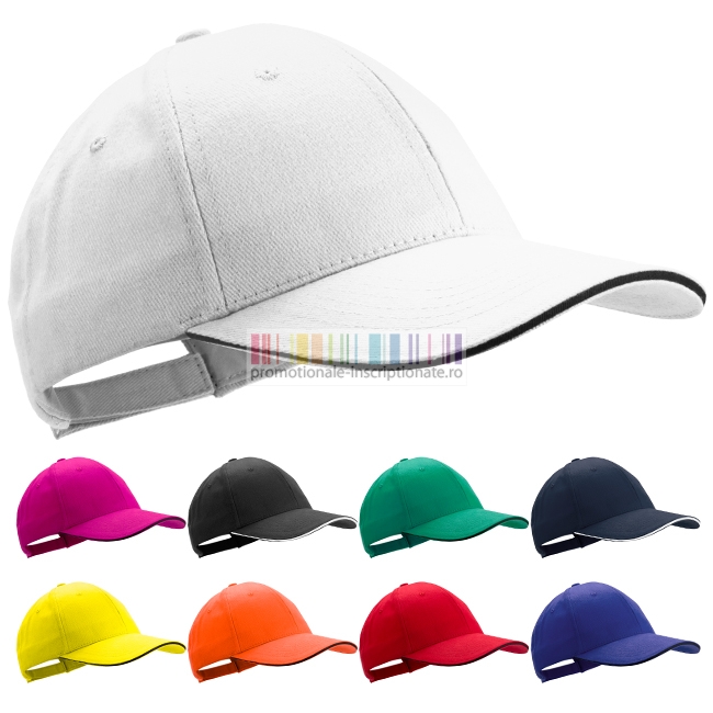 Sapca promotionala tip baseball, confectionata din bumbac 100% si disponibila in noua culori, cu sase panele, gauri pentru aerisire si inchidere ajustabila prin banda cu scai.