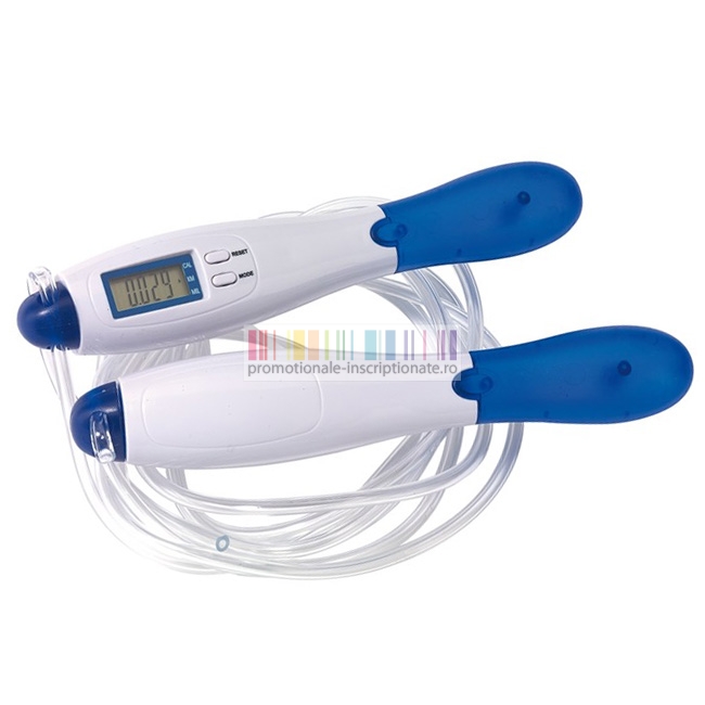 Coarda fitness promotionala pentru sarit, ajustabila, cu manere ergonomice realizate din plastic si afisaj digital pentru numarul sariturilor efectuate, numarul caloriilor arse si distanta parcursa in kilometri si mile.