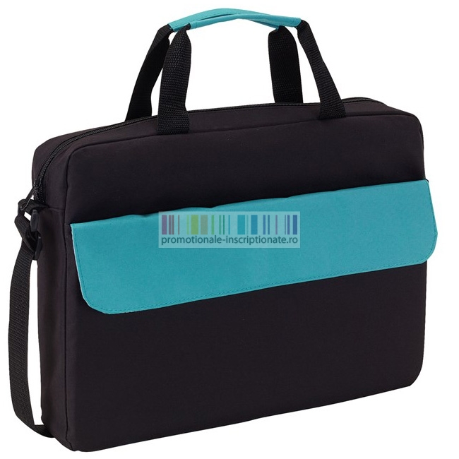 Geanta promotionala neagra de conferinta, confectionata din poliester 300D, cu buzunar frontal cu inchidere prin clapeta disponibila in sase culori, cu compartiment principal spatios cu fermoar, manere intarite si bareta detasabila si ajustabila pentru umar.