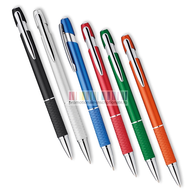 Pixuri metalice disponibile in 6 culori, cu mecanism de deschidere prin apasare, pasta de scris albastra, grip cu striatii, inel decorativ si accesorii cromate.