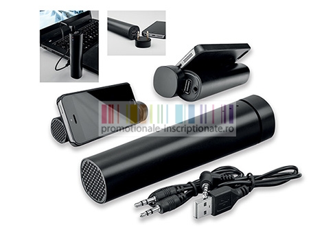 Powebank promotional cu capacitate de 3200 mAh si 2 speakere de 2W cu cablu USB / audio inclus.