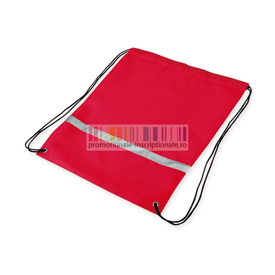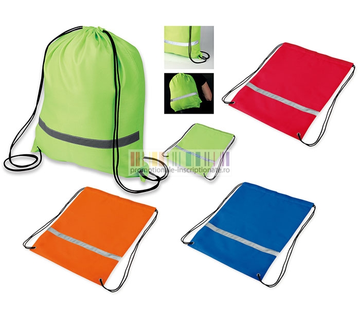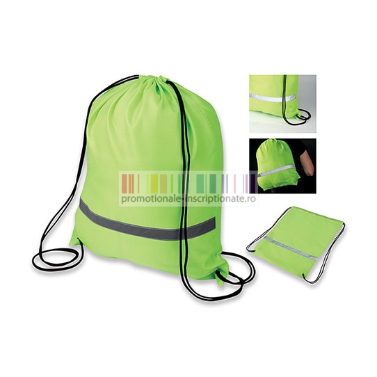 Rucsac promotional verde, confectionat din poliester si disponibil in 4 culori cu snururi negre si banda gri reflectorizanta.