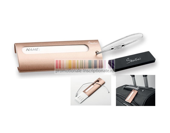 Eticheta promotionala pentru bagaje, realizata din metal auriu cu finisari de inalta calitate marca Santini.