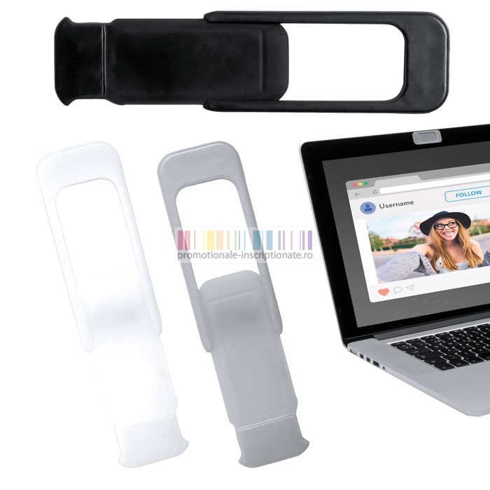 Dispozitive promotionale realizate din plastic si disponibille in 3 culori pentru camere video de laptop, cu capac anti-spionare si suprafata autoadezive pentru fixare.
