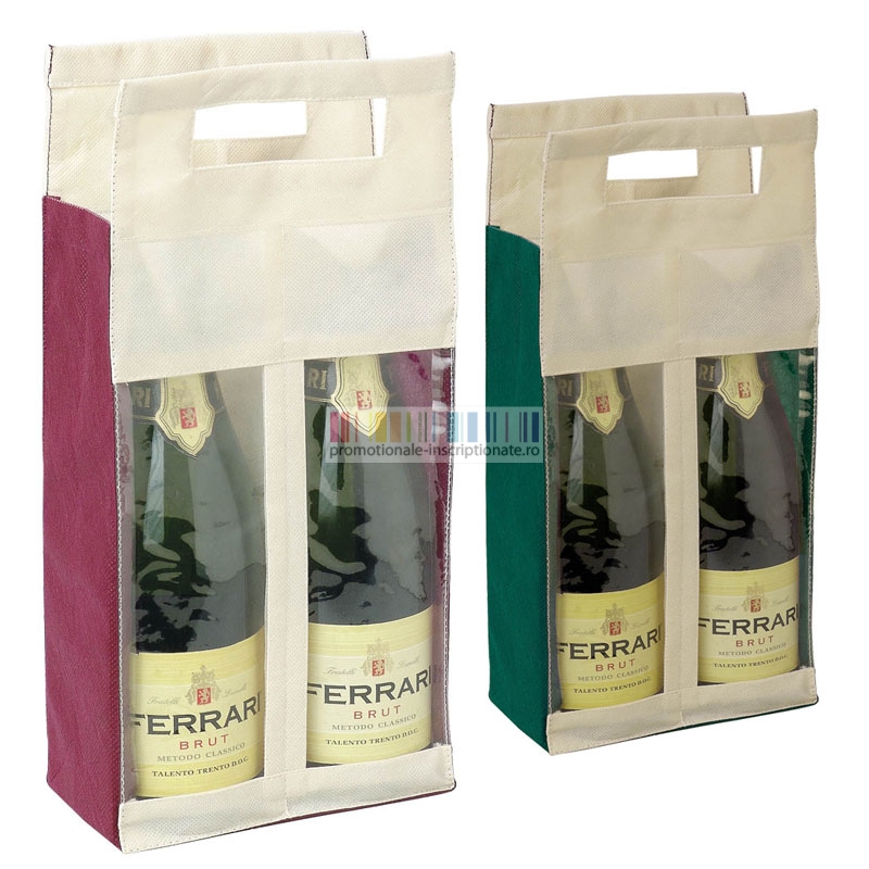 Sacose promotionale realizate din material netesut cu compartiment pentru 2 sticle de vin, cu design clasic elegant, fereastra transparenta si manere rezistente.