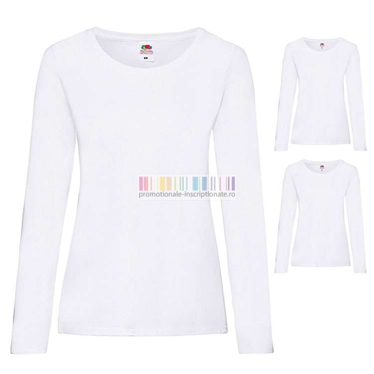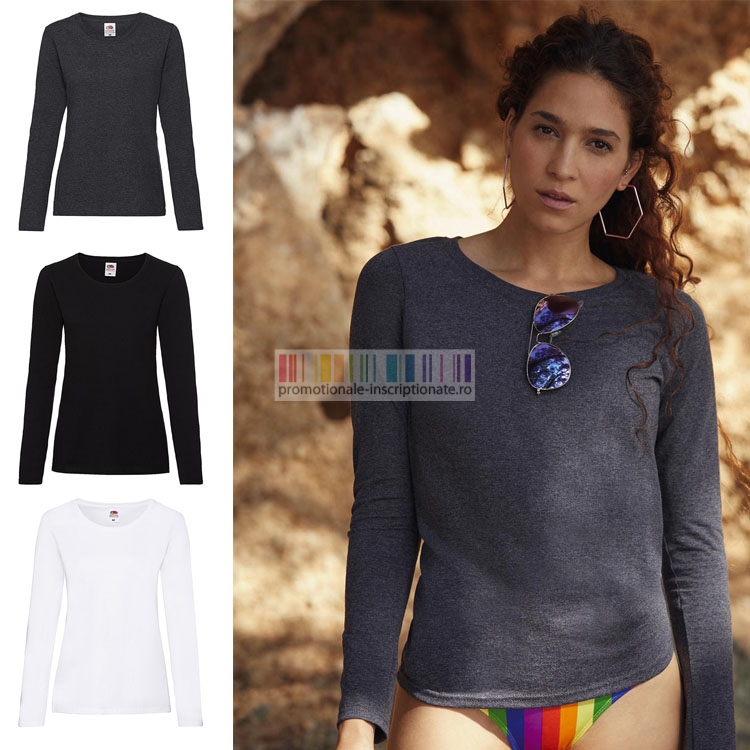 Tricouri promotionalede dama cu maneca lunga si guler larg rotund, confectionate din bumbac de 165 gr/mp, disponibile in 3 culori si marimi de la S la 2XL, cu croiala lunga feminina si cusaturi laterale.