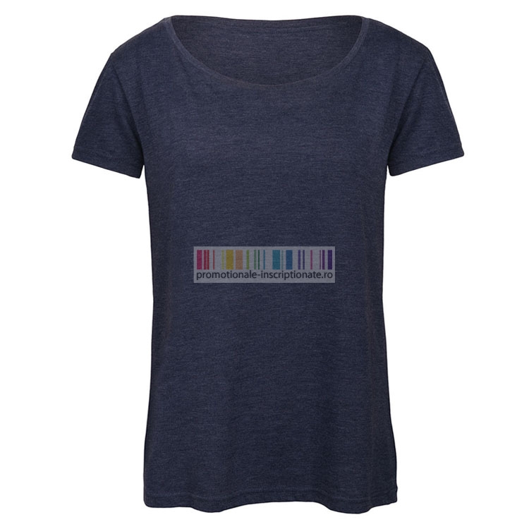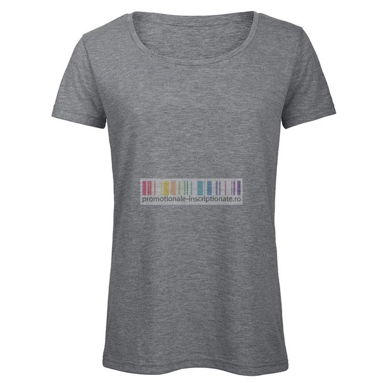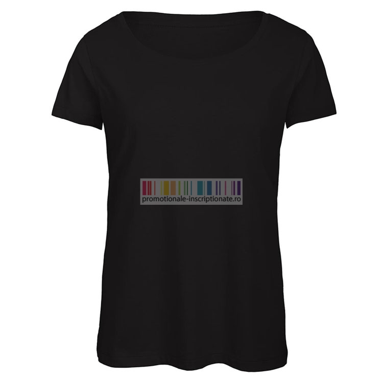Tricouri promotionale de dama confectionate din bumbac, poliester si vascoza, cu maneci scurte, guler rotund, cusatura dubla la maneci si talie, cusatura laterala si banda de la umar la umar.