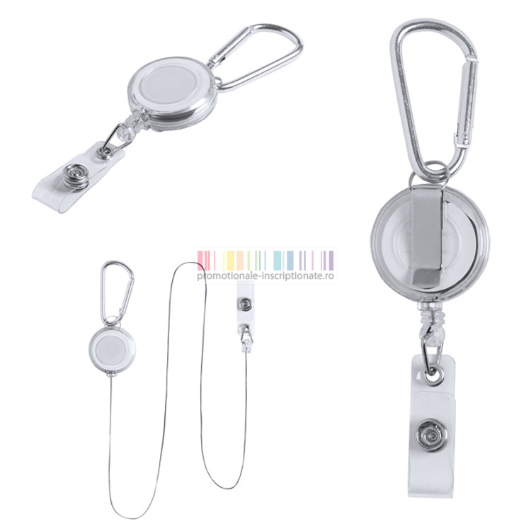 Suport promotional pentru ecusoane realizat din plastic cu forma rotunda, cu mecanism retractabil, carabina metalica si inchidere prin capsa.