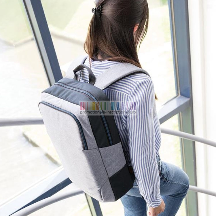 Rucsaci promotionali cu compartiment buretat pentru laptop si baterie de tip powerbank incorporata, realizati din poliester cu design modern si finisari de inalta calitate, cu buzunar frontal cu inchidere prin fermoar si buzunar principal multicompartimentat cu inchidere prin fermoar dublu.