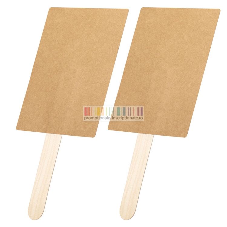 Evantaie promotionale realizate din carton, cu forma dreptunghiulara, maner din lemn si suprafata mare pentru inscriptionare.