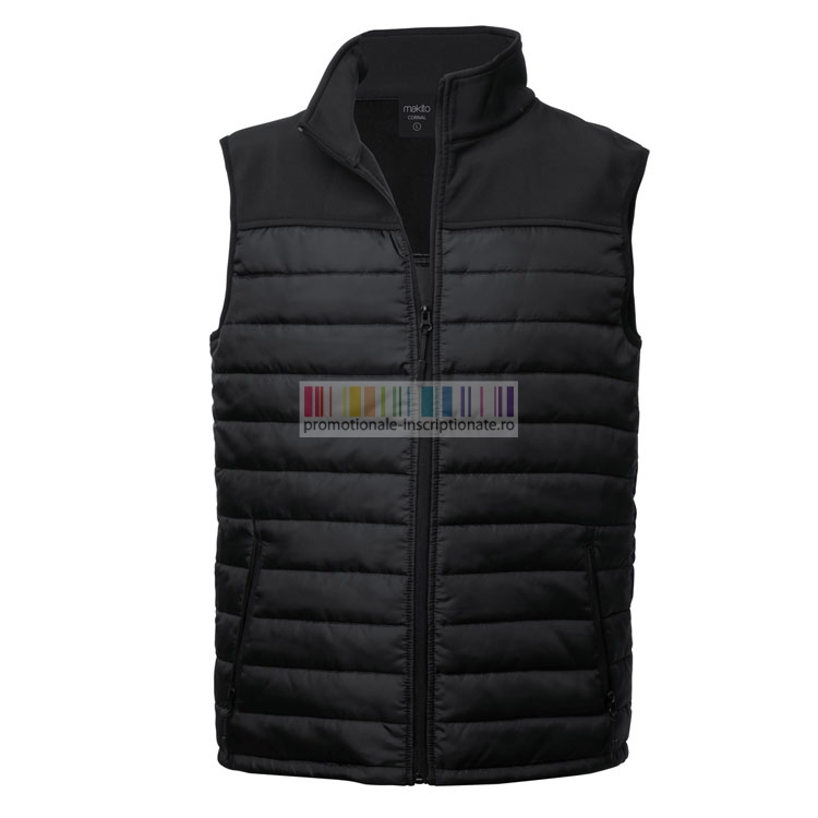 Veste promotionale negre matlasate confectionate din poiester cu marimi disponibile de la S la XXL, cu guler inalt, inchidere prin fermoar si doua buzunare frontale cu fermoar.