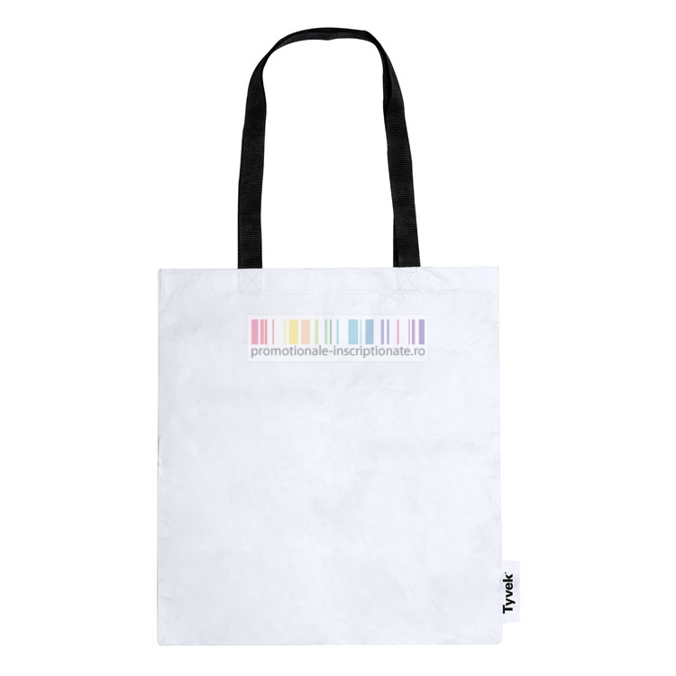 Sacose promotionale albe de cumparaturi realizate din materiale reciclabile, cu greutatea maxima de 7 kilograme si 2 manere lungi negre pentru sustinere.