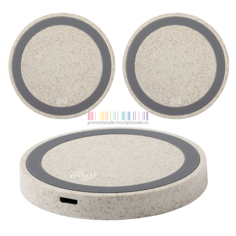 Incarcatoare wireless promotionale realizate din plastic si fibre din paie de grau cu forma rotunda, cu baza antiaderenta, capacitate de 1000 mAh si cablu USB inclus.