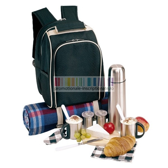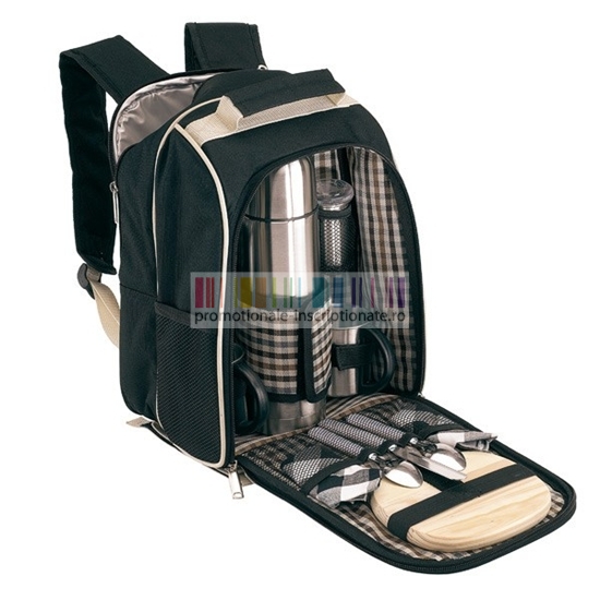 Rucsacuri promotionale de picnic confectionate din poliester, pentru 2 persoane, dotat cu tacamuri, cani si termos din otel inoxidabil, cutit de paine, servetele, plansa din lemn pentru taiat si 2 recipiente pentru sare si zahar din otel inoxidabil.