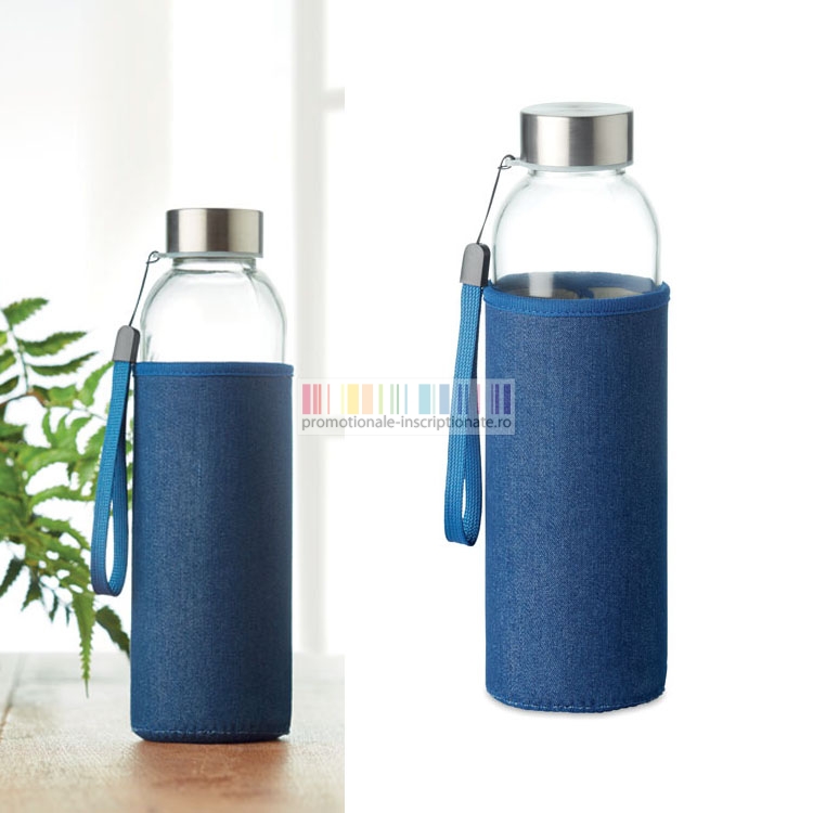 Bidoane promotionale de baut realizate din sticla cu capacitate de 500 mililitri si husa cu aspect denim, cu capac metalic argintiu si snur pentru prindere.