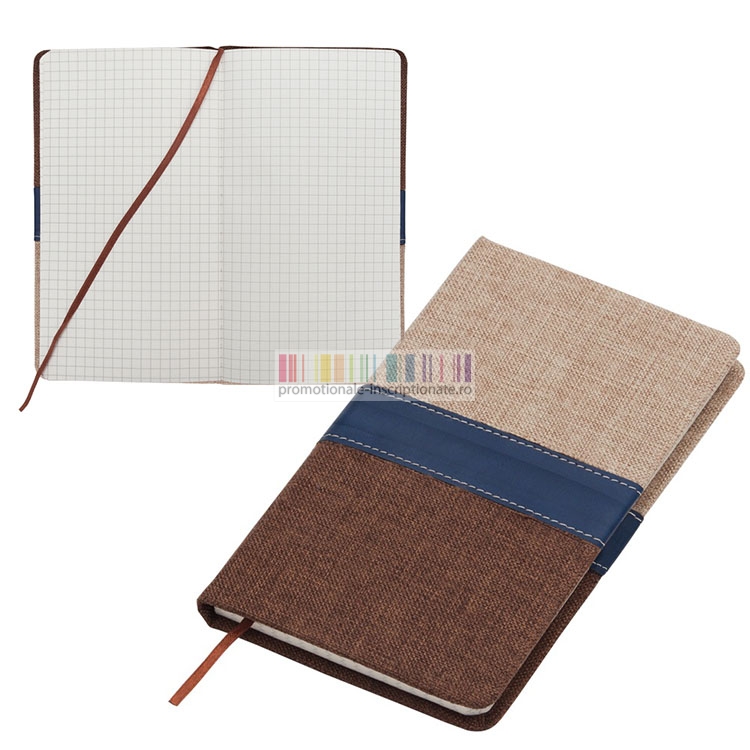Carnetele promotionale A5 cu 160 de file de matematica, cu coperti bicolore din carton si material textil, cu semn de carte si banda din imitatie de piele aplicata pe coperta.