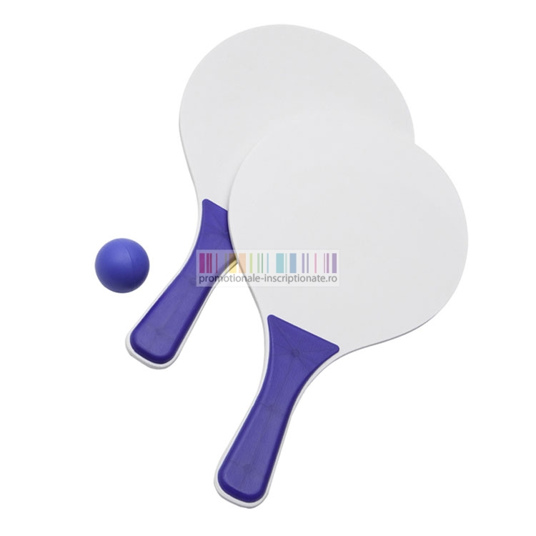 Seturi de 2 palete promotionale cu maner albastru realizate din lemn, cu minge inclusa din plastic.