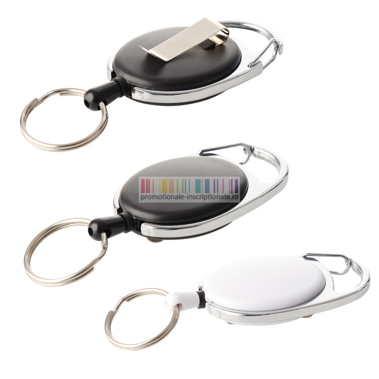 Suporturi promotionale de tip pass holder pentru legitimatii, realizate din plastic si metal si disponibile in 2 culori cu clema pentru agatare, fir retractabil de 86 cm si carabina pentru prindere.