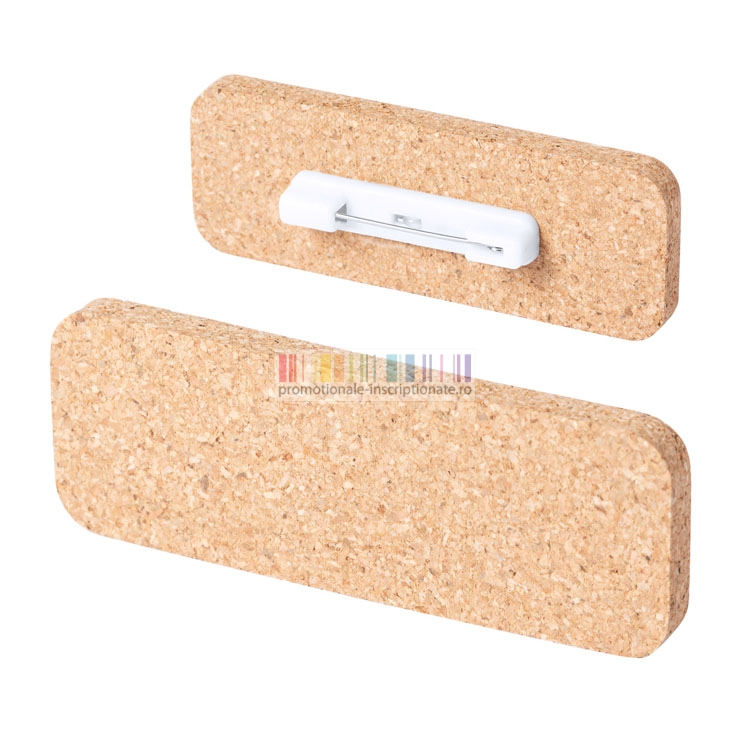 Ecusoane promotionale realizate din pluta cu forma dreptunghiulara si colturi rotunjite, cu suprafata mare de inscriptionare si prindere prin ac.