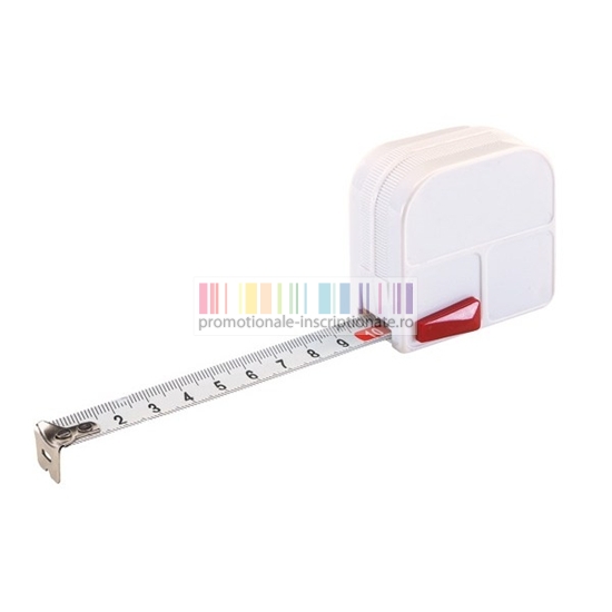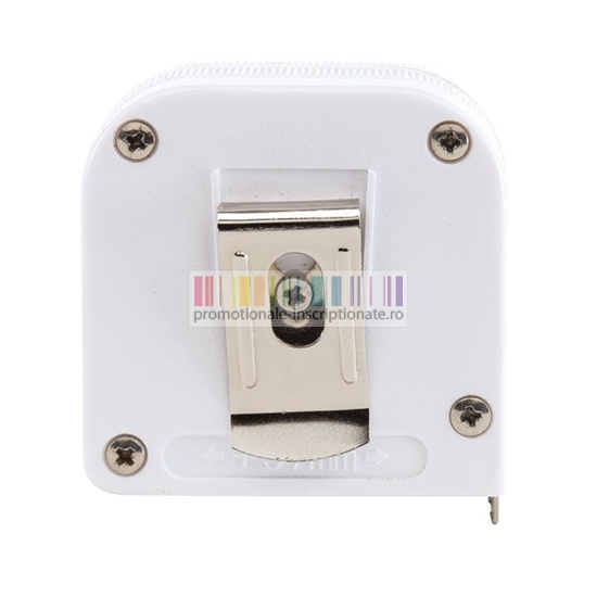 Ruleta promotionala cu lungime de 2 m, carcasa alba, banda alba de masurat, piedica automata si clips metalic.